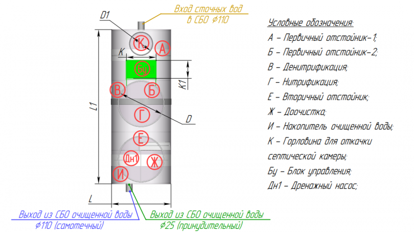 Септик Биодевайс ПРОФ представляет собой промышленную станцию биологической очистки сточных вод, разработанную для решения задач водоотведения на объектах с высокими объёмами сброса. Система отличается продуманной конструкцией с шестью технологическими отсеками, обеспечивающими многоступенчатую обработку стоков — от первичного осаждения до глубокой биохимической очистки.