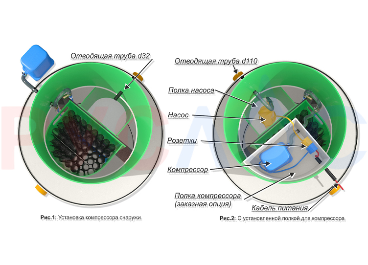 Руслос Аэро идеально подходит для загородных домов, дач и небольших коттеджных посёлков. Станция оснащена двумя отводящими трубами и предусматривает два способа сброса стоков, что делает её универсальной для различных условий установки.