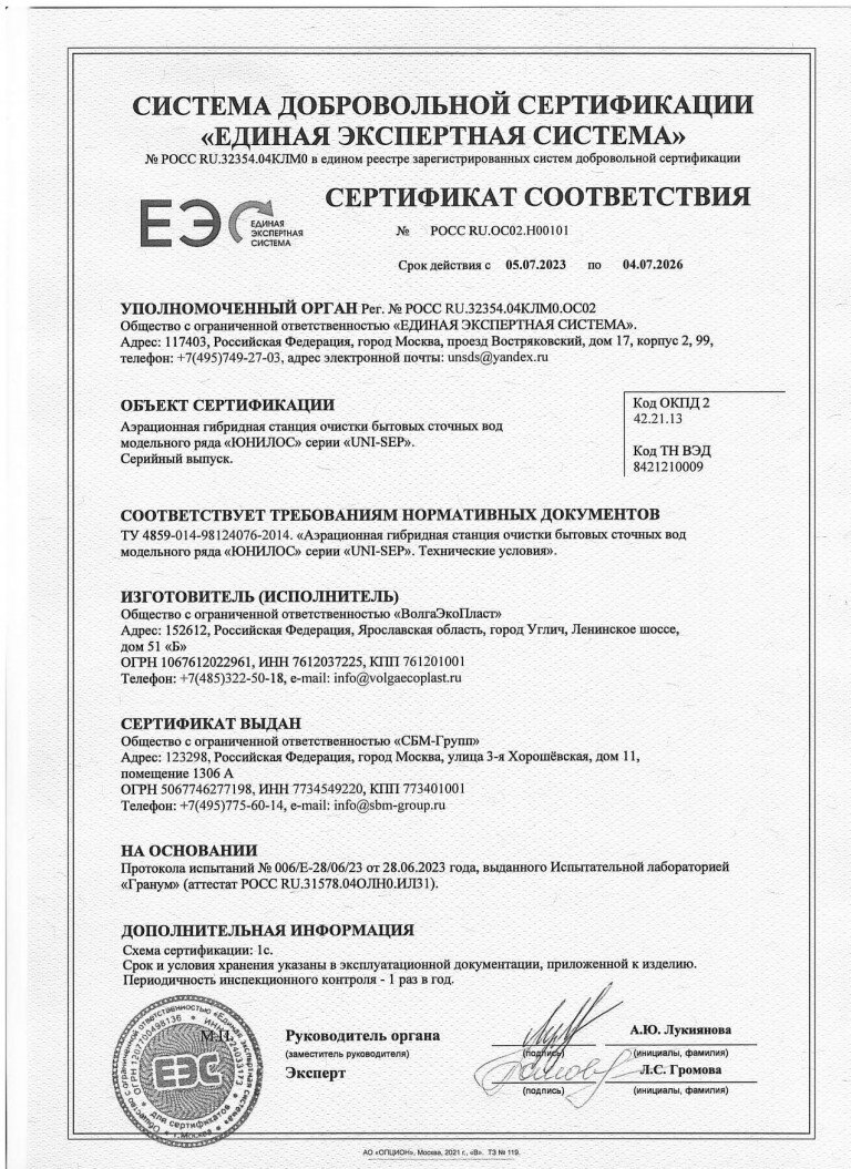Аэрационная гибридная станция UNI-SEP сертифицирована в соответствии с ГОСТ 25298-82 и СанПиН. Продукция защищена патентами, а каждый комплект сопровождается декларацией соответствия и гарантийным талоном от производителя.
